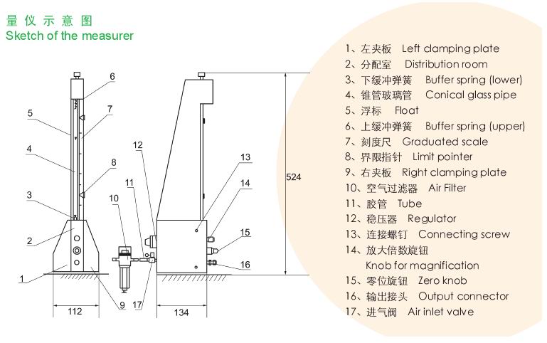 1、用途: 配上中原的各种测量头及测量装置,可实现下列测量项目:内径、外径、槽宽、孔距、深度、厚度、圆度、锥度、同轴度、直线度、平面度、平行度、垂直度、通气度和密封性等。 要求: 气源工作压力为:0.3~0.7MPa 2、浮标式气动量仪QFB-A型 本仪器与各种气动测量头或气动量仪装置配套使用,用比较测量法对被测件的尺寸或形位参数进行精密测量。根据被测量参数的需要, 本仪器可相应拼合成多管形式(最多至十管)。 外形尺寸(长×宽×高): 单管:134×112×524mm 多管:增加一管,宽度增加29mm 重量:4.4kg (每增加一管,重量增加2.3kg)。